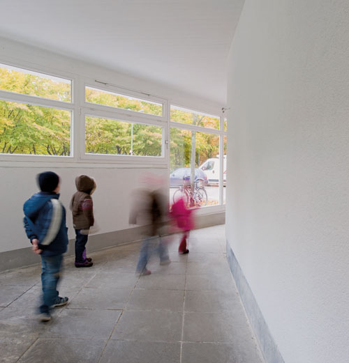 Die wichtigsten Elemente der Baumaßnahmen waren neben der umfassenden energetischen Sanierung die Verbesserung der vormals abschreckenden Eingangssituation, hier wurde ein attraktiver Vorplatz mit Sitzgelegenheiten geschaffen. In der gesamten Kita wurde der Lichteinfall durch Rückbaumaßnahmen der auskragenden Dächer verbessert, außerdem wurden die beiden Gebäudeteile mit einem energetisch wirksamen Glasgang verbunden.