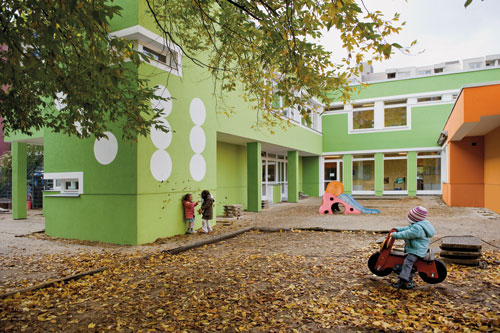 Als "häßliches Entlein" stand die Kita Pillnitzer Weg inmitten einer schmucklosen Hochhaussiedlung – das war einmal. Heute heben sich die beiden Gebäudeteile als farbenfrohe Würfelelemente ab. Dort lernen Kinder spielerisch, Farben und Zahlen als Anhaltspunkte zur Orientierung zu verwenden, denn die Altersgruppen (ein bis sechs Jahre) sind als Würfelpunkte außen an den Gebäuden sichtbar.