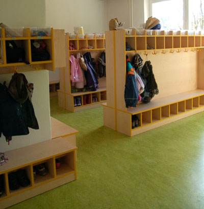 Die Erneuerung der Fenster, ein neu gestalteter Flur mit großzügigem Garderoben-Bereich sowie ein lichter, einladender Gruppenraum und ein Leitungsbüro komplettieren den Umbau der Kita.
